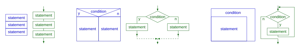 Die drei grundlegenden Strukturen: Sequenz, Auswahl, Wiederholung dargestellt als Nassi-Shneiderman-Diagramm (blau) und Programmablaufplan (grün).