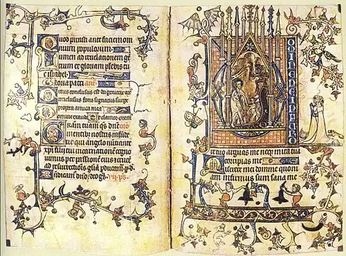 - Figürliche Initialen auf punktiertem und rautenförmigem Goldgrund, Stab- und Efeublatt-Bordüren mit Drolerien und anderen figürlichen Randverzierungen.