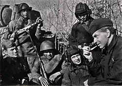 Ilja Ehrenburg (rechts im Bild) 1942 im Gespräch mit Panzersoldaten der Roten Armee