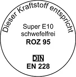 Nach § 13 der Verordnung über die Beschaffenheit und die Auszeichnung der Qualitäten von Kraft- und Brennstoffen (10. BImSchV) sind im geschäftlichen Verkehr die gewährleisteten Qualitäten an den Zapfsäulen sowie an der Tankstelle „deutlich sichtbar zu machen“. In Deutschland findet man deshalb an allen Benzin-Zapfsäulen für E10 die in der 10. BImSchV (Anlagen 1a-c und 2a) geforderten runden Aufkleber mit dem Text: