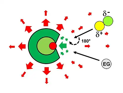 Zusätzlich zu der koordinativen Edelgas-Bor-Bindung tragen Dispersionswechselwirkungen und die Elektrostatik zur Stabilisierung des Edelgaskomplexes bei. Die elektrophile Bindungsstelle befindet sich innerhalb eines Kraters, der durch fünf teilweise negativ geladene Substituenten X definiert wird, die einen großen Wechselwirkungsbereich für die Ausbildung anziehender London-Dispersionskräfte bieten. Das gebundene Edelgas-Atom hingegen liefert dem benachbarten Boratom Elektronendichte und wird somit schwach positiv, wodurch eine anziehende und stabilisierende elektrostatische Wechselwirkung zu den umgebenden Substituenten eine Rolle spielen könnte (vgl. Abb. 6).