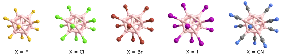 | [B12F11]− | [B12I11]− | [B12Cl11]− | [B12Br11]− | [B12(CN)11]− | |