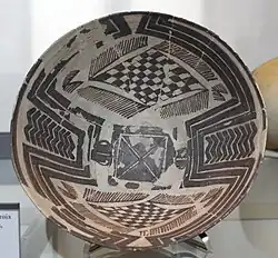 Auf der Akropolis war etwa gleichzeitig eine massive 1,7 Meter hohe und 7 × 12 Meter große Plattform errichtet worden. In und um diese Plattform sollen etwa 2000 reich mit kunstvoll verzierter Keramik ausgestattete Gräber gefunden worden sein. Die Bestattungen lagen dicht bei dicht und zum Teil übereinander. Die Leichen fanden sich ausgestreckt. Mehrere Keramikgefäße als Beigaben waren die Regel. Daneben fanden sich als Beigaben insgesamt 55 Kupferäxte und 11 Kupferscheiben. Vier waren durchbohrt und mögen an einer Kette gehangen haben.[12] Die Bemalung der Keramik, oftmals in geometrischen Formen, stellt einen ersten Höhepunkt des Kunstschaffens dieser Gegend dar.[13] Aus dieser Periode stammen auch verschiedene Tierfiguren aus hellem Ton, die oftmals mit braunen Flecken dekoriert sind.[14] In der Periode Susa IB wurde darüber eine weitere Plattform eventuell mit Tempelbauten errichtet. Sie war etwa 70 × 65 Meter groß, etwas über 10 Meter hoch und mit Keramikkegeln dekoriert.[15]