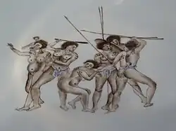 Das Rundbild einer Gruppe von Aborigines bildet das innere Zentrum beider Bowleschalen. Das gleiche Bild in beide Bowleschalen impliziert, dass die chinesischen Keramikkünstler dieselbe Zeichnung als Vorlage benutzten und dass die Bowleschalen am selben Ort und zur selben Zeit gefertigt wurden. Auf dem Rundbild sieht man vier männliche Aborigines mit Keulen, Schild und Speeren, eine Frau mit Baby auf ihren Schultern – stehend und sich von den übrigen Figuren leicht wegbewegend – und eine andere Frau von den Männern eingeschüchtert. Es wird vermutlich eine einleitende Trauungszeremonie dargestellt.[29] Wie bei dem Sydney Cove Bild auf der ANMM-Bowleschale existiert keine bekannte Abbildung, welche die Keramikkünstler benutzt haben könnten, um die Gruppe von Aborigines zu malen. Die engste Übereinstimmung ist eine Zeichnung nach einer mittlerweile verlorengegangenen Originalskizze von Nicolas-Martin Petit.[30] Er war ein Künstler, welcher zwischen 1800 und 1803 an der französischen Expedition nach Australien teilnahm, die von Nicolas Baudin angeführt wurde.[6] Die jüngsten Forschungen deuten darauf hin, dass während der Baudin-Expedition ein Bericht an Kaiser Napoleon Bonaparte über die Möglichkeit einer Eroberung der britischen Kolonie in Sydney Cove vorbereitet wurde.[31][32] Während der Expedition um die Küste von Australien herum fortschritt, begann sich Petit in der Erstellung von Porträts von Aborigines zu spezialisieren.[30] Die französische Expedition erreichte am 25. April 1802 Port Jackson.[33] Eine von Petits Zeichnung wurde kopiert und erschien als Abbildung 114 in der Voyage autour du monde : entrepris par ordre du roi (Paris, 1825),[34] betreffend einer Reise um die Welt (1817–1820) unter der Leitung von Louis-Claude de Saulces de Freycinet.[6] Der Kupferstich trägt den Titel Port Jackson, Nlle Hollande. Ceremonie preliminaire d’un mariage, chez les sauvages[35] (Zeremonie vor der Eheschließung von Eingeborenen, Port Jackson, New Holland). Die Aborigines bei Port Jackson gehören dem Eorastamm an, welcher im Sydneybecken lebt.[36] Nur indigene Leute werden auf beiden Bowleschalen dargestellt.