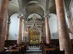 Den Eingang erreicht man über eine fünfstufige Freitreppe. Das Portal wird von vier Säulen ionischer Ordnung flankiert. Am Gebälk ist eine hebräische Inschrift angebracht. Vom Vestibül kommt man links zum kleinen Betsaal, auch Wintersynagoge genannt, der heute als Museumsraum genutzt wird. An der rechten Seite des Vorraums befindet sich die Treppe zur Frauenempore, die von zwei Säulen gestützt wird. Der Frauenempore gegenüber, an der Ostwand, befindet sich der prächtige Thoraschrein, der von Säulen gerahmt und von den Gesetzestafeln bekrönt wird. Vier Säulen teilen den Raum in drei Schiffe. Vor dem Thoraschrein steht die schlichte Bima mit einem einfachen Lesepult. Der Thoraschrein wurde 1809 vermutlich von Giuseppe Maria Bonzanigo geschaffen. Im Jahr 1816 wurde er vergoldet. Auf seinen acht Feldern befinden sich Darstellungen zur jüdischen Liturgie.