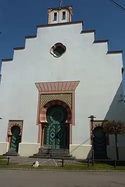 Über einem rechteckigen Grundriss erhebt sich ein zweigeschossiger Bau, der von einem Satteldach gedeckt wird. Die beiden gestuften Giebel sind Stilelemente der Gotik. Die drei Portale der Westfassade besitzen Hufeisenbögen und ägyptisch anmutende Palmettenkapitelle. Die Giebelabschlüsse bestehen im Westen aus den Gesetzestafeln und im Osten aus der Ehernen Schlange.
