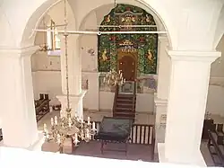 In der Mitte des Betsaals wird die hölzerne Bima von vier Pfeilern und einem Gewölbe gerahmt. An der Ostmauer befindet sich der Thoraschrein aus der Zeit 1777/78.