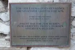 Beim Abriss des Wohnhauses Annagasse 2 im Jahr 1994 wurde der Türrahmen der Synagoge an der nordöstlichen Ecke der Südwand des Gebäudes geborgen und nach der Restaurierung an der Stadtmauer aufgestellt. Die hebräische Inschrift in Übersetzung lautet: „Dies ist das Tor zum Herrn, Gerechte werden dahin eintreten.“