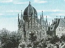 Das Bauwerk war als Backsteinbau mit einer Haupt- und zwei Nebenkuppeln ausgeführt. Über der an der Ostwand gelegenen Thoranische war eine symbolische Gebotstafel angebracht. An der Westwand befand sich der Eingang, über dem die Galerie als Sitzbereich für die Frauen verlief.[4] Insgesamt besaß die Synagoge 200 Plätze, obwohl die Gemeinde zu dieser Zeit nur aus rund 100 Mitgliedern bestand.[3]