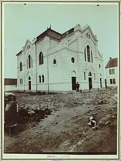 Eine seit 1860 in einem Privathaus untergebrachte Synagoge (das Haus wurde 1995 abgerissen) war um die Jahrhundertwende zu klein geworden. Daher wurde der Architekt Lipót Baumhorn mit dem Bau einer neuen Synagoge beauftragt. Diese wurde 1907–1908 errichtet.[1] Nach der Ermordung der jüdischen Bevölkerung im Holocaust ließen die staatlichen Behörden das nicht mehr genutzte Gebäude 1954 abreißen. An seine Stelle wurde ein Wohnblock errichtet. Lediglich die Eingangstür befindet sich im örtlichen Museum und die Sitzbänke und Kronleuchter sind heute in der protestantischen Kirche des nahegelegenen Dorfes Selo.[2]