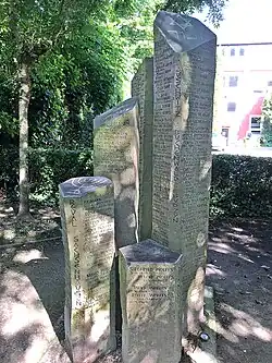 In den 1970er Jahren begann die Aufarbeitung der Geschichte der Juden in Aurich. Auf dem Grundstück der Synagoge wurde ein erster Gedenkstein errichtet. Seit 1992 erinnern dort Basaltsäulen mit Namen an die Holocaustopfer aus Aurich. Der Auricher Steinmetz Bernd Clemenz hat sie entworfen. Auf den Breitseiten sind die bekannten Lebensdaten zu sehen, während auf den schmalen Längsseiten die Namen der Lager aufgeführt werden, in die die Betreffenden gebracht wurden. Eine Säule gestaltete Clemenz oben flach, um einen Stein niederlegen zu können. Am 9. November 2007 ergänzte der Steinmetz die Gedenkstätte um eine weitere Steinsäule, die ein Modell der Auricher Synagoge trägt.[4]