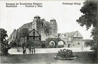 Die Synagoge Friedberger Anlage war eine im Jahr 1907 fertiggestellte Synagoge in Frankfurt am Main, Friedberger Anlage 6. Mit 1600 Plätzen war sie der größte jüdische Sakralbau in Frankfurt. Ihre Architektur war gekennzeichnet vom Übergangsstil der Reformarchitektur mit Elementen der Neoromanik und des Orientalismus.[1] Die Synagoge wurde bei den Novemberpogromen 1938 von nationalsozialistischen Brandstiftern vorsätzlich zerstört und anschließend abgetragen. Ein im Zweiten Weltkrieg an ihrer Stelle errichteter Hochbunker und der Vorplatz dienen heute als Erinnerungsstätte.