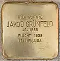 - Im November 2021 wurden in der Innenstadt von Güssing zehn Stolpersteine verlegt. Zwei davon vor dem Rathaus, in Erinnerung an den letzten Rabbi von Güssing, Jakob Grünfeld (1865–1947), und seine Frau Ida Grünfeld geb. Baum (1886–?). Beide lebten im Rabbinerhaus neben der Synagoge.[30][31]
