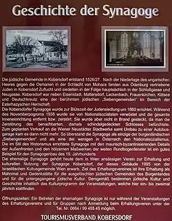 - ↑ a b c 150 Jahre Synagoge Kobersdorf. Archiviert vom (nicht mehr online verfügbar) am 29. Dezember 2014; abgerufen am 30. April 2015. Info: Der Archivlink wurde automatisch eingesetzt und noch nicht geprüft. Bitte prüfe Original- und Archivlink gemäß Anleitung und entferne dann diesen Hinweis.
