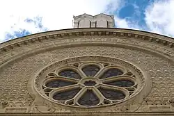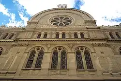 Die Fassade zur Rue des Tournelles besteht aus Kalksteinquadern. Den Rundgiebel bekrönen die Gesetzestafeln. Er ist von einer Rosette mit acht Speichen durchbrochen und mit einer hebräischen Inschrift der Verse 19 und 20 des Psalms 118 versehen: Öffnet die Tore des Heils, ich will sie durchschreiten und den Herrn ehren; hier ist das Tor des Ewigen, die Gerechten werden es durchschreiten. Unter der Rosette sind Widderhörner und an den Seiten die Torarollen und von Bändern umgebene Palmzweige dargestellt. Darunter befinden sich von kannelierten Pilastern mit korinthischen Kapitellen umgebene Doppelarkaden. In den Zwickeln der zentralen Dreierarkade über dem Portal ist das Wappen der Stadt Paris, der Eigentümerin des Gebäudes, angebracht. Die drei mittleren Arkaden des Erdgeschosses entsprechen dem Hauptschiff und die seitlichen Arkaden den beiden Seitenschiffen.