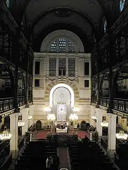 Der Chor liegt vier Stufen erhöht und ist durch ein schmiedeeisernes Gitter vom Langhaus abgetrennt. Unter einer großen Arkade, weitere sechs Stufen erhöht und ebenfalls durch ein Eisengitter getrennt, ist, von einem Seidenvorhang verhüllt, der Toraschrein untergebracht. Über dem Schlussstein der Arkade befinden sich, aus schwarzem Marmor, die Gesetztafeln. Die große, durchbrochene Steinplatte der Wandnische, deren Öffnungen mit farbigem Glas gefüllt sind, lässt gedämpftes Licht einfallen.