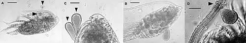 Verschiedene Ruderfußkrebse der Familie Paracalanidae, infiziert von Ellobiopsis chattonii. (A,B) Paracalanus indicus mit anhaftenden Parasiten. (C,D) Parvocalanus crassirostris mit diesem Parasiten.Familie Ellobiopsidae(N)