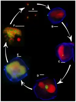 Lebenszyklus von Amoebophrya spp. (grün) und ihrem Wirt Alexandrium fundyense (Pyrocystaceae, blau/rot).FISH-Aufnahmen von Stadien im Lebenszyklus von Alexandrium fundyense (blau/rot) und Amoebophrya spp. (grün)