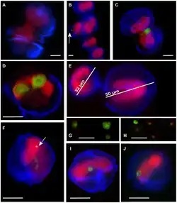 Im Gegensatz zu anderen Dinoflagellaten verfügt Syndinium wie auch die anderen Mitglieder der Ordnung Syndiniales nicht über das herkömmliche Dinokaryon oder den damit verbundenen Prozess der Dinomitose. Stattdessen besitzen Syndinium-Vertreter weniger, aber größere Chromosomen als die meisten anderen Dinoflagellaten, nämlich nur 4 im Vergleich zu den sonst typischen 20 und mehr.[35]Syndinium zeichnet sich durch mitotische Kernteilungsmechanismen aus, bei denen die Kinetochoren an der Kernmembran befestigt sind und die damit verbundenen V-förmigen Chromosomen durch axial ausgerichtete Mikrotubuli voneinander weggeschoben werden.[36] Diese Methode der Kernteilung ist bei Dinoflagellaten zwar nicht ganz selten, wurde aber erstmals bei Syndinium untersucht.