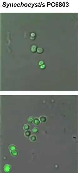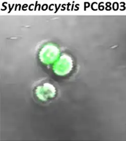Eine ganze Reihe von Cyanobakterien sind Modellmikroorganismen für die Untersuchung der Photosynthese, der Kohlenstoff- und Stickstoffassimilation, der Evolution von Plastiden (Chloroplasten etc.) und der Anpassungsfähigkeit an Umweltstress. Synechocystis sp. PCC 6803 ist eine Linie einzelliger Süßwasser-Cyanobakterien der Gattung Synechocystis und wird vom NCBI als Spezies gelistet.[2] S. sp. PCC 6803 ist eine der am besten untersuchten Arten von Cyanobakterien, denn diese Cyanobakterien sind sowohl zu autotrophem (phototrophem Wachstum durch Photosynthese während der Lichtperioden) als auch zu heterotrophem Wachstum durch Glykolyse und oxidative Phosphorylierung während der Dunkelperioden fähig (Mixotrophie).[18] Der Photosyntheseapparat selbst ist dem von Landpflanzen sehr ähnlich. Der Organismus zeigt auch eine phototaktische Bewegung. Die Genexpression wird durch eine zirkadiane Uhr (circadian clock) reguliert, und der Organismus kann sich Übergänge zwischen den Licht- und Dunkelphasen effektiv einstellen.[19] S. sp. PCC 6803 kann leicht exogene DNA aufnehmen, zusätzlich zur Aufnahme von DNA durch Elektroporation, Ultraschalltransformation und Konjugation.[20]