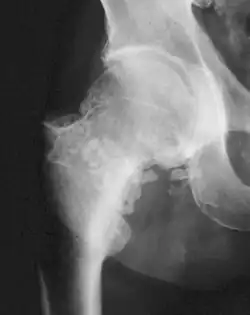 Die synoviale Chondromatose ist eine radiologische Blickdiagnose. Als gefürchtete Komplikation ist die Entstehung eines sekundären Chondrosarkoms zu sehen.[9][10] In einer größeren Studie mit 53 Fällen in 30 Jahren wurden drei Chondrosarkome diagnostiziert.[4]