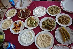 Eingeleitet wird das Abendessen, welches die eigentliche Hauptmahlzeit darstellt, mit verschiedenen Mezze. Diese kleinen Gerichte können cremige Pasten wie Hummus und Auberginenmus sein, werden über gegrilltes oder eingelegtes Gemüse mit Joghurtsoße gegeben, oder mit Brot von einem gemeinsamen Teller gedippt. Auch frische Salate aus Tomaten, Weizen und gehackter Petersilie, die Taboulé, gehören zu den Vorspeisen.