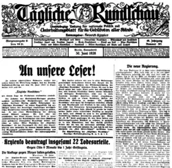 - ↑ „An unsere Leser!“, Tägliche Rundschau, 30. Juni 1928, 48. Jg., Nr. 301, Ausgabe B, Seite 1