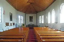 Die Saalkirche wurde 1911/12 erbaut und 1960 erweitert. Sie besteht aus einem Langhaus, einem dreiseitig geschlossenen Chor im Osten, einem Chorflankenturm an der Nordwand des Chors, der mit einem spitzen Helm bedeckt ist, und einem Anbau an der Südwestecke des Langhauses, in dem sich das Vestibül befindet, und der mit einer Zwiebelhaube bedeckt ist.
