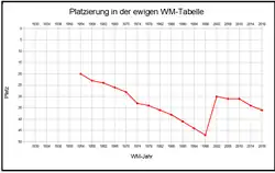 | 10 WM-Spiele 5 Siege 1 Unentschieden 4 Niederlagen 20:17 Tore | |