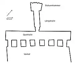 Der Vorhof wurde horizontal in den Felsen geschnitten, wobei die Fassade durch acht unregelmäßig-viereckige Pfeiler gebildet wird. Die dahinter liegende Querhalle ist 20 m lang und 2,6 m breit und in der Mitte der Westwand führt ein Durchgang über eine Schwelle und eine Türkammer (allerdings ohne nachweisbare Tür) in die Längshalle, in deren hinterem Teil sich ein Schacht befindet. An die Längshalle schließt sich im Westen die Statuenkammer an, in der sich vier überlebensgroße Sitzstatuen befinden.[2]