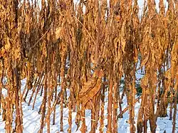 Die geernteten Tabakblätter werden mehrere Wochen lang getrocknet. Der Wassergehalt der Blätter sinkt von 90 % direkt nach der Ernte auf einen Gehalt von etwa 15 %, die Blätter färben sich braun und chemische Abbauprozesse setzen ein. In Deutschland war bis 2010 die Trocknung in Tabakschuppen die bevorzugte Methode. Solche Tabakschuppen, meist große hölzerne Gebäude, sind typisch für die (süddeutschen) Tabakanbaugebiete. Die aktuell (2020) angebauten Virginsorten werden ausschließlich künstlich getrocknet. Die Versorgung mit Saatgut und die Fachberatung für die Pflanzer wurde von der NiCoTa GmbH übernommen, die dem Bundesverband Deutscher Tabakpflanzer nahesteht.[6][7][8]