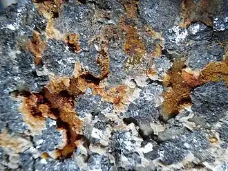 - Sphalerit (ZnS): nicht sehr häufig; Mikrokristalle, die mit Bleiglanz assoziiert sind.