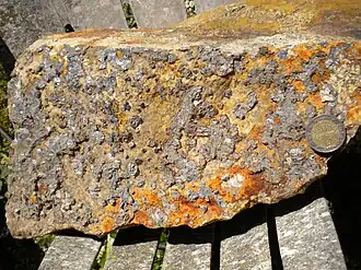 - Pyrit (FeS2): relativ selten; sphärische Kristallaggregate aus millimetergroßen Einzelkristallen auf Quarz, manchmal auch auf Dolomit.