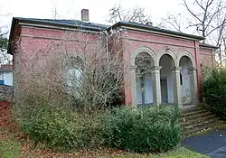 Das rote Backsteingebäude besitzt einen Mittelrisalit, der auf das Gräberfeld ausgerichtet ist. Eine Freitreppe führt zur dreifachen Arkade, deren profilierte Bögen auf dorisch-toskanischen Säulen ruhen. Ein rustizierter Sockel umzieht das Gebäude.[1]