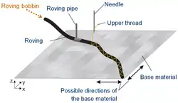 Ausgehend von Stickmaschinen, wie sie ursprünglich in der Bekleidungs- und Textilindustrie eingesetzt wurden, wurde die Technik so weiterentwickelt, dass Faserrovings direkt auf ein Basismaterial abgelegt und gleichzeitig fixiert werden können. Dabei handelt es sich meist um Carbonfaserrovings mit etwa 3.000 bis 50.000 Einzelfilamenten. Die Herstellung des Preforms erfolgt kontinuierlich durch das Aufbringen eines einzelnen Rovings. Dieser wird von einer Spule abgewickelt, durch ein Führungsrohr vor die Nadel geleitet und dort im Zickzackstich aufgebracht. Führungsrohr und Spannrahmen – in dem das Basismaterial fixiert ist – bewegen sich dabei synchron in kleinen Schritten zur Nadelposition. Der Stickkopf mit Spule, Führungsrohr und Nadel lässt sich beliebig um 360 Grad drehen.