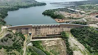 Das Absperrbauwerk ist eine Gewichtsstaumauer aus Beton mit einer Höhe von 106 (bzw. 120)[2] m über der Gründungssohle (74 m über dem Flussbett). Die Länge der Bauwerkskrone beträgt 340 m. Die Staumauer ist an der Basis 79,5 m breit. Das Volumen der Staumauer umfasst 675.000 m³.[1] Das Fundament liegt auf einer Höhe von 233 m über dem Meeresspiegel.[3]
