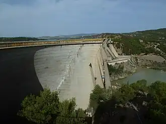 Das Absperrbauwerk ist eine Kombination von Bogenstaumauer und Pfeilerstaumauer aus Beton (Mehrfachbogenstaumauer mit 5 Bögen) mit einer Höhe von 65 (bzw. 72)[2] m und einer Kronenlänge von 470 m.[1] Die Mauerkrone liegt auf einer Höhe von 270 m über dem Meeresspiegel.[3]