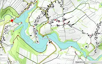 Die Talsperre liegt auf dem Boden der Gemeinde Weismes unterhalb von Ovifat und Robertville. Auf einer Anhöhe warcheabwärts, 800 Meter Fußweg von der Staumauer entfernt steht die Burg Reinhardstein.