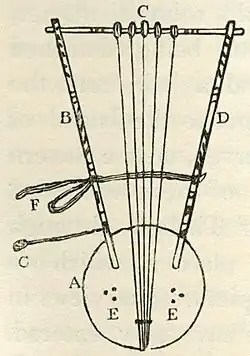Später, in osmanischer Zeit, verbreitete sich das Wort tanbūr mit Langhalslauten erneut in Ägypten. Europäische Forschungsreisende erwähnten als erste tanbūra genannte Leiern. Carsten Niebuhr (1733–1815) berichtete in Reisebeschreibung nach Arabien und andern umliegenden Ländern (1774–1778) von „einer Art Harfe“, die er im nubischen Dunqula sah und die von den Nubiern kussir und von den Arabern tambura genannt wurde. Der Schweizer Orientreisende Jean Louis Burckhardt (1784–1817, Travels in Nubia, London 1819[8]) stellte fest, dass die Nubier außer einer fünfsaitigen, mit Gazellenhaut bespannten tamboura, einer Flöte und einer Kesseltrommel keine weiteren Musikinstrumente besaßen. Die Strichzeichnung am Rand des Textes zeigt eine fünfsaitige Leier mit rundem Korpus, wie sie noch heute vorkommt. Der Name der Schilluk-Leier, tom oder thum, ist vermutlich eine Kurzform von tambūra.[9]
