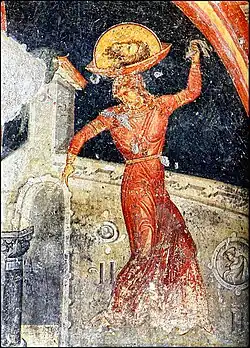 Die in zahlreichen mittelalterlichen Kunstwerken, etwa in Handschriftenillustrationen und der Kathedralplastik, dargestellte Erzählung, in der der Tanz eher kritisch gesehen wird, ist die Passage vom „Tanz der Salome“ im Kontext der Hinrichtung Johannes des Täufers,[6] in welcher die Darstellung des Tanzes als „dionysisch(e) Grenzüberschreitung“[4] per se galt. Salome ist die Stieftochter des Herodes. Aufgrund der Ausgefallenheit ihrer Tanzkunst, die vermutlich sowohl Elemente des akrobatischen Tanzes als auch des erotisierenden Tanzes vereint hatte, leistete Herodes ihr ein offenes Versprechen (in der Kulturwissenschaft rash boon genannt). Die Mutter Salomes Herodias nutzte diese Situation, um Johannes den Täufer töten zu lassen. Der Tanz der Salome fungiert hierbei als erzählerischer Zwischenschritt, damit die Figur des Herodes sein Versprechen hält. Daher wird Salomes erotisierender Tanz durchweg als „Exempelfigur für die Lasterhaftigkeit des weiblichen Tanzes“[1] herangezogen. Dabei steht sie beispielhaft für die „weibliche Sündhaftigkeit und ekstatisch-diabolische Entgrenzung im Tanz.“[1]