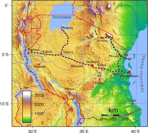 Die heute wichtigste Verbindung ist die Central Line, die von Daressalam über die Hauptstadt Dodoma zum Hafen Kigoma am Tanganjikasee führt.[5] Diese Haupt-Ost-West-Verbindung hat mehrere Äste: