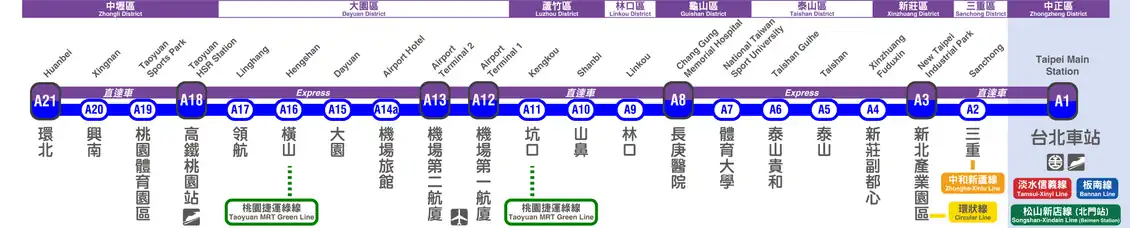Auf der Flughafenlinie verkehren zwei Arten von Zügen: Nahverkehrszüge – Linie Blau (englisch Commuter), auch Pendlerzüge genannt, und Expresszüge – Linie Violett (englisch Express). Damit Passagiere schnell vom Flughafen Taoyuan in die Innenstadt von Taipei hin und zurück kommen, lassen die Expresszüge zahlreiche Stationen aus. Sie halten nur an den Stationen A1 Hauptbahnhof Taipeh, A3 New Taipei Industrial Park, A8 Chang Gung Memorial Hospital, A12 Flughafen-Terminal 1 und A13 Flughafen Terminal 2, der gegenwärtige Endstation der Expresszüge (Stand 2023).