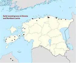 Nach Alter und Bauweise werden sie in: Frühe, typische und späte Tarandgräber eingeteilt. Frühe Formen wurden in der Küstenzone Nord- und Westestlands, auf den Inseln im Süden Finnlands, in Ostmittelschweden, in Nordlettland und Kurland gefunden.[2] In Estland und Nordlettland wurden etwa 500 Gräberfelder gefunden. Sie sind ziemlich gleichmäßig verteilt, mit Ausnahme von Westestland. Die estländischen Tarandgräber sind besonders groß, wohingegen die finnischen klein sind und eine obskurere Konstruktion haben. Die schwedischen Tarandgräber waren lange schlecht zu finden. Aufgrund der C14-Datierung war es möglich, sie auf die Bronzezeit und die früheste Eisenzeit zu datieren, eine überraschend frühe Datierung, im Vergleich zu den finnischen und baltischen Gräbern, die jedoch in einer neu ausgegrabenen Gruppe bestätigt wurde[3].