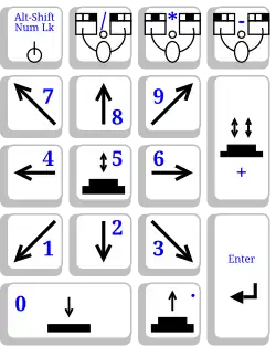 - Unter Windows XP kann man über Num zwischen Tastaturmaus und entweder Nummernblock oder Cursorblock umschalten (abhängig von der Konfiguration). Eine gleichzeitige Verwendung ist aber nicht möglich.