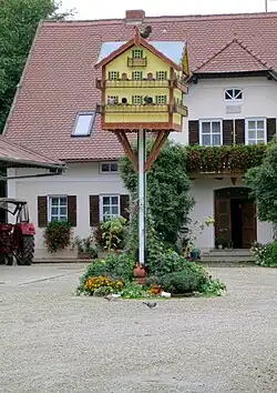 Das Taubenhaus aus Holz in Form eines zweigeschossigen Wohnhauses ist fantasievoll geschmückt. Auf dem Dach sitzt ein Hahn.