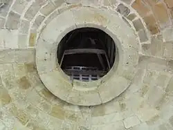 Der achteckige Taubenturm ist in die Umfassungsmauer der Abtei integriert.
