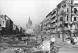 Als zentral gelegene Straße erfuhr die Tauentzienstraße im Zweiten Weltkrieg massive Schäden durch alliierte Luftangriffe. Bei Kriegsende war auf der Nordseite die gesamte Bebauung bis auf zwei Häuser vollständig zerstört, auf der Südseite ebenso, hier allerdings waren zwei Gebäude teilweise wieder herstellbar, unter ihnen das KaDeWe, das im Laufe der 1950er Jahre wieder aufgebaut wurde.[14] Der Tauentzienpalast blieb ebenfalls erhalten. Heute, 2025, steht dort das Kaufhaus Peek & Cloppenburg.