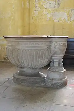 Das Taufbecken aus Stein besitzt zwei Becken und einen Holzdeckel aus neuerer Zeit. Das größere Becken wurde für die Taufe genutzt, das kleinere diente zur Aufbewahrung des geweihten Wassers. Am großen Becken mit Godronierung ist folgende Inschrift am oberen Rand angebracht: „NISI QUIS RENATUS FUERIT EX AQUA ET SPIRITU SANCTO NON POTEST INTROIRE IN REGNUM DEI“ (Wer nicht aus dem Wasser und dem Heiligen Geist wiedergeboren wird, kann nicht in das Reich Gottes eingehen).