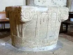 Das Taufbecken aus Kalkstein besitzt die Form eines Kapitells. Das Becken ist an den Ecken mit Voluten und dazwischen mit Reliefs von Arkaden geschmückt.