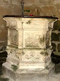 Das achteckige Taufbecken aus Stein besitzt an allen Ecken einen Pilaster, der auf einer Konsole in Form eines runden Blattes steht. Das reich mit Reliefs verzierte Taufbecken steht auf einem ebenfalls achteckigen Sockel.